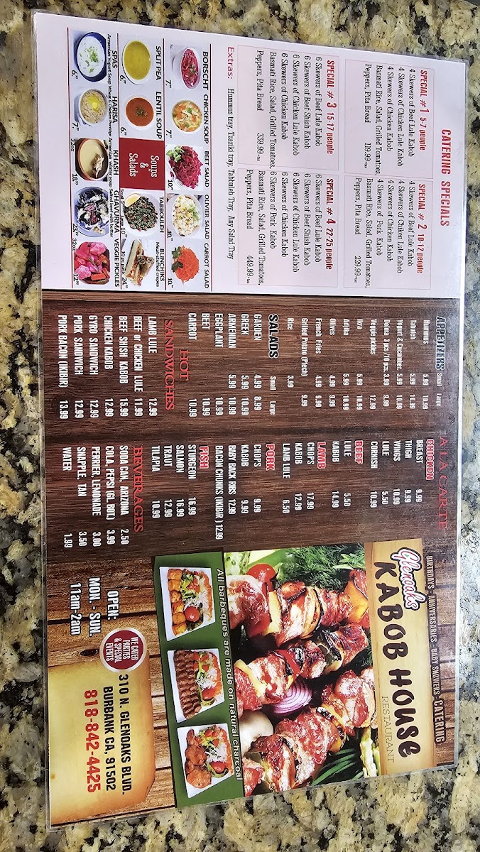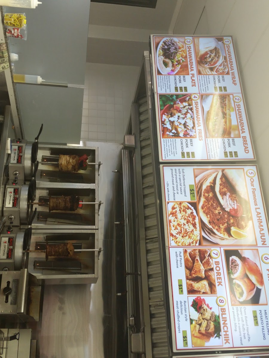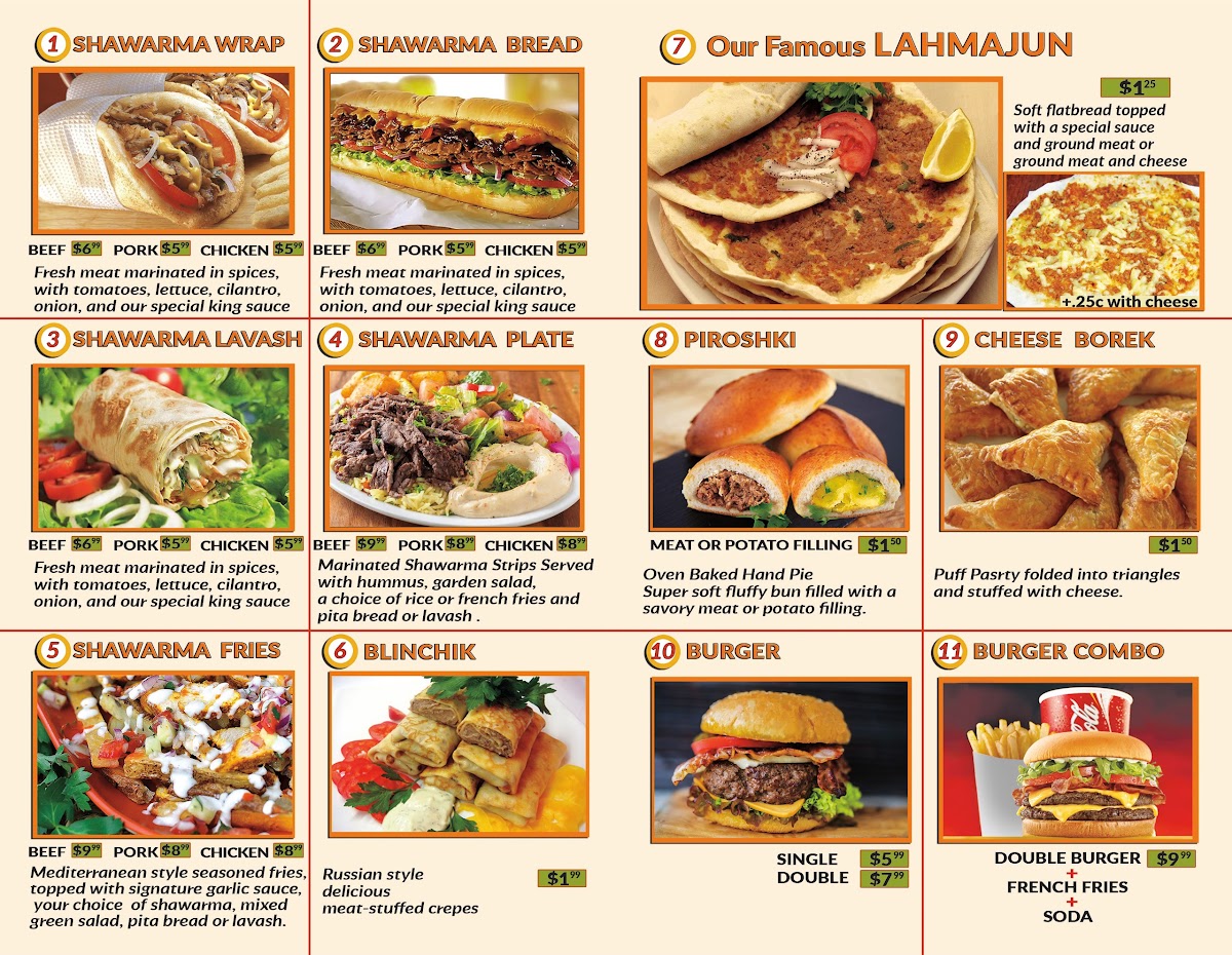 Shawarma King offers a diverse and satisfying menu that brings together a variety of flavorful dishes. For those in the mood for salads, options like the EggPlant Salad, Carrot Salad, and TabboulehOlivier Salad stand out as fresh and vibrant choices, while the Greek Salad provides a classic Mediterranean touch. If you're thirsty, the restaurant has a selection of beverages including Bottled Soda (Glass), Canned Soda, and refreshing Perrier water. Featured items like the hearty Shawarma Fries Plate and flavorful Gyro Plate are perfect for anyone craving a filling meal, and the Falafel Plate is a great choice for vegetarians. For something a bit lighter, try the Shawarma Lavash or Falafel Wrap for a more portable option. Appetizers such as Rice, Dolma, and OlivesAdjika Dip offer a delicious start to your meal, while side orders like Pita Bread (One Bag) and Garlic Sauce are great for customizing your experience. Shawarma King also offers a selection of homemade soups, including comforting options like Khash, a traditional Armenian winter soup, and Harissa, a hearty wheat and chicken porridge. For a unique Eastern European touch, try the Borscht Red Soup or Split Pea Soup. Whether you’re looking for a filling entrée, a light wrap, or a comforting soup, Shawarma King has something for everyone.